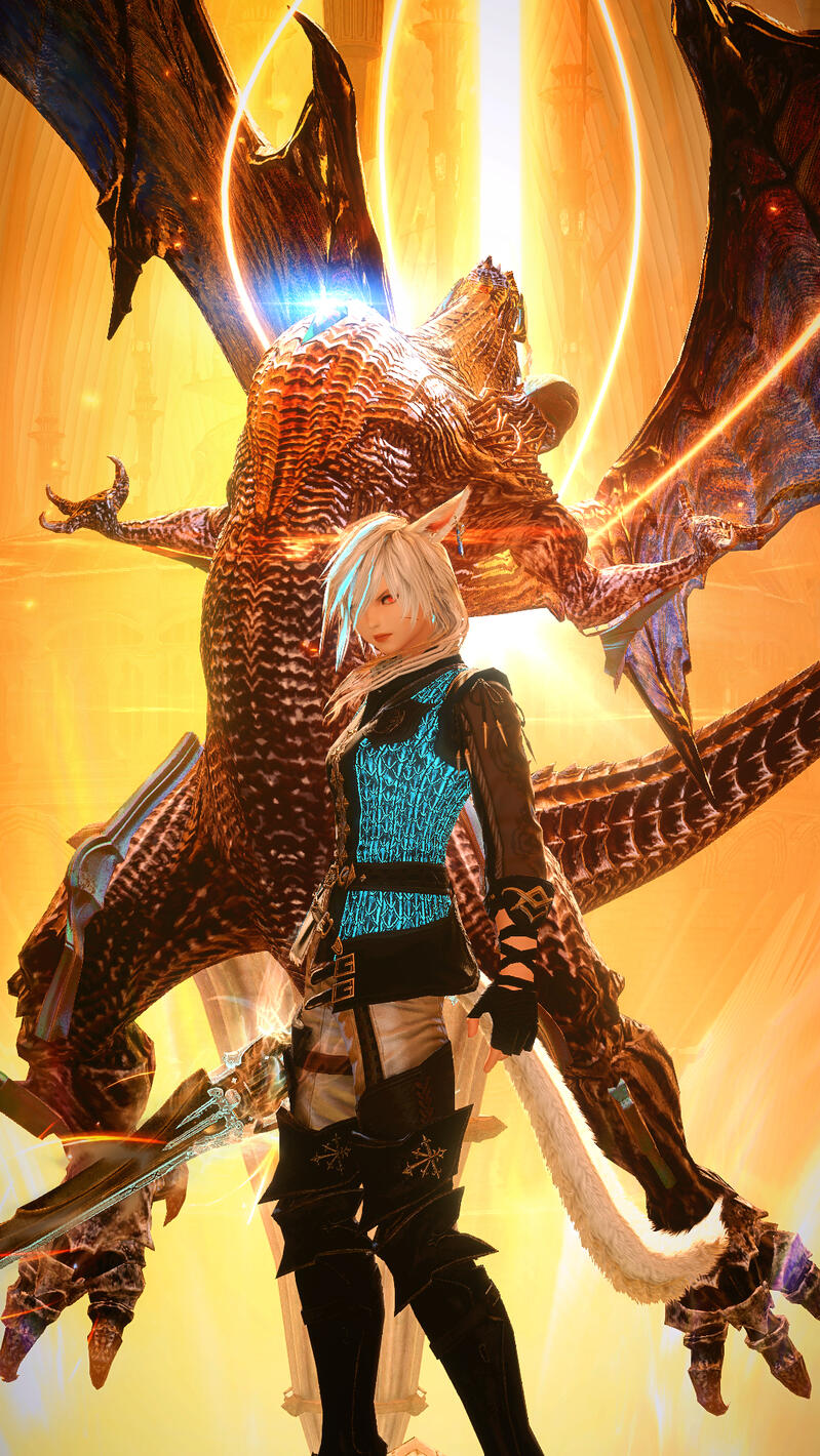 While trying to flee, a fragment of his aether struck Iris in the heart and she fell unconscious. What she didn't realise was that the draconic aether would persist, shrouding her soul and remaining dormant in her core.Over time, however, as Iris grew older, Bahamut began to stir within her. His aether slowly merged with her's, their souls intertwining. Iris started to hear the voice of the Dreadwyrm, his impulses urging her to commit destruction in his name. When she refused his demands, Bahamut attempted to take control of her body. Sprouting draconic wings, Iris almost leveled Coerthas on her lonesome. However, she was able to tame her fragment of Bahamut and cast it back into the depths of her soul. It was her body, and anyone who wished to inhabit it would bow to her.
